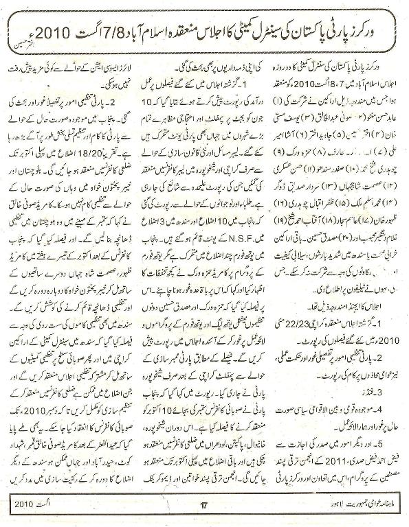 Workers Party Pakistan CC Meeting Islamabad dated 7/8 August 2010 by Akhter Hussain general secretary